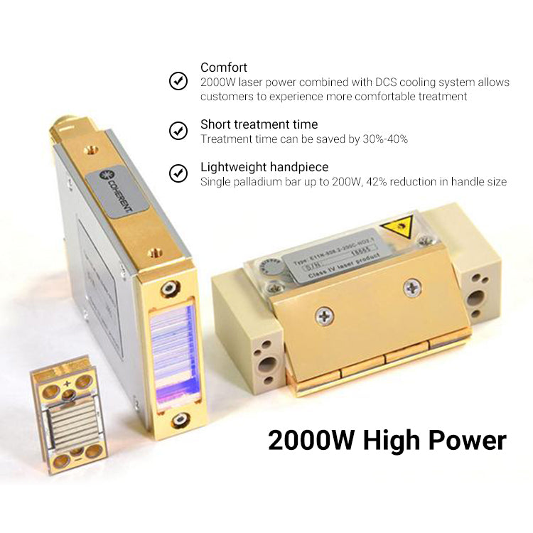 - 4 Wavelength diode laser hair removal machine system, Suitable for all hair types and skin tones: The 4-wavelength system offers a range of wavelengths, including 755nm, 808nm, 940nm, and 1064nm, which are specifically tailored for different skin tones and hair types. The 755nm wavelength is ideal for light hairs on white skin, the 808nm wavelength is effective for black hairs on yellow skin, and the 1064nm wavelength targets deep-rooted hairs on darker skin. This customized wavelength selection ensures precise and effective hair removal for diverse clients.
